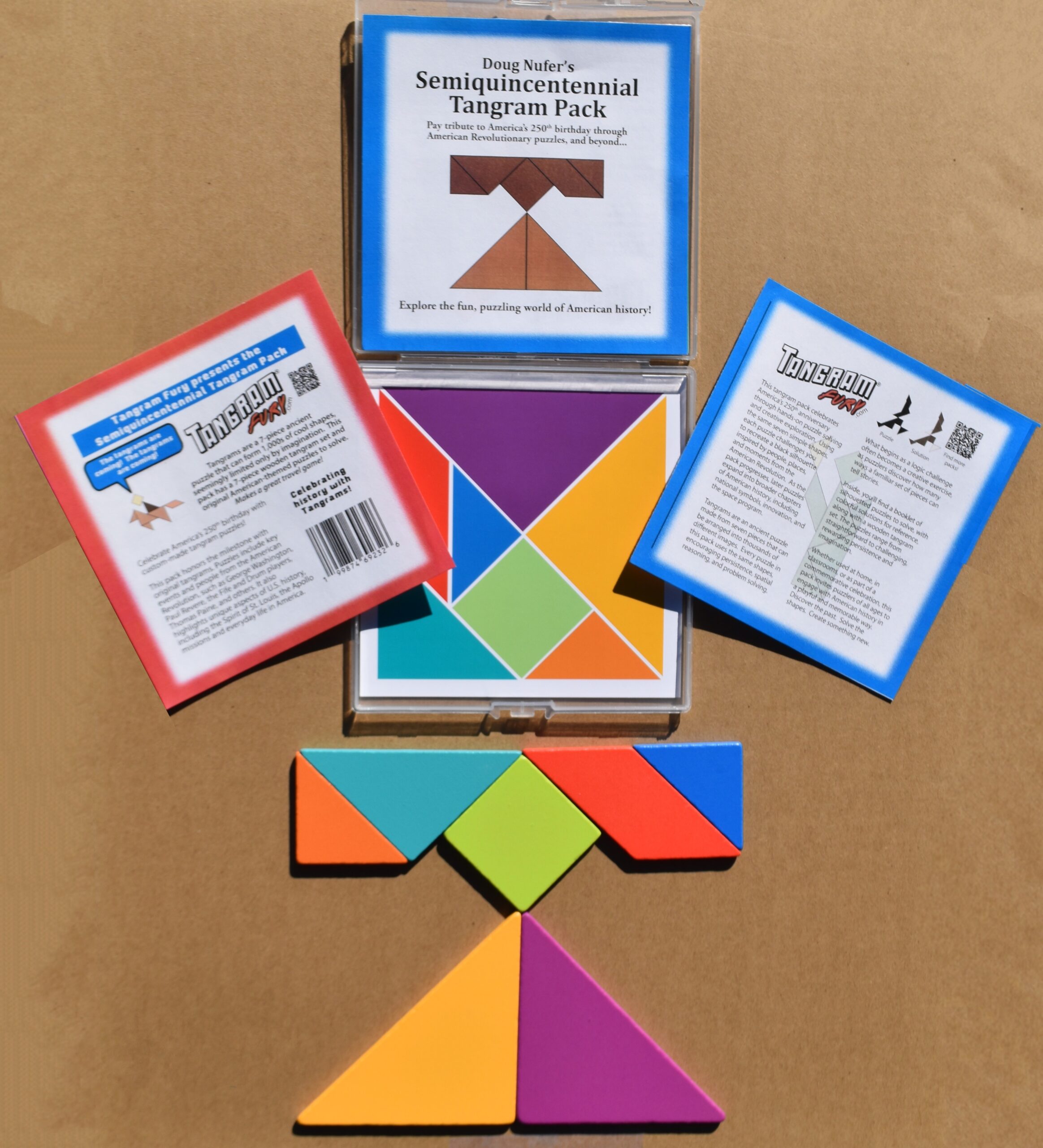 What’s included: Each pack contains a color booklet with clear instructions and dozens of themed puzzles, with full-color solutions printed on the reverse side of each page; colorful wooden pieces of the traditional 7-piece tangram; a colored storage guide that shows exactly how to arrange the pieces when finished; and a clear plastic case that holds everything in a neat, compact container measuring 5.5″ × 5.5″ × 1/2″. The entire pack weighs less than 5 oz, making it easy to store and simple to take along on trips by car, plane, boat, or bicycle.