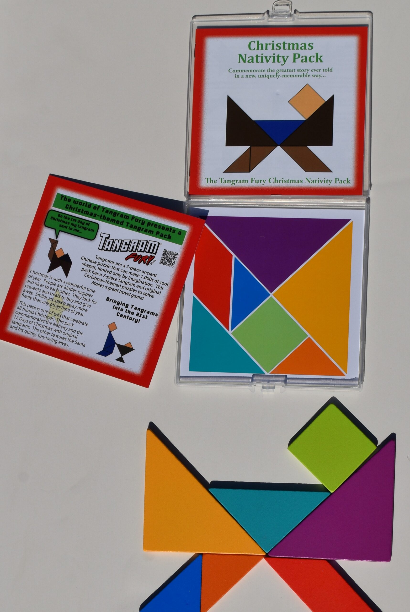 Each Nativity Tangram Pack includes a full-color booklet with clear instructions and dozens of themed silhouette puzzles to solve, with their colorful solutions printed on the reverse side of each page. You’ll also receive a set of vibrant wooden pieces of the classic seven-piece tangram, a color-coded guide that shows exactly how to store the pieces when you’re finished, and a clear plastic storage case that neatly holds everything in a compact 5.5″ × 5.5″ × ½” container. Weighing less than five ounces, this pack is easy to store at home and simple to take along on trips by car, plane, boat, or even a bicycle.