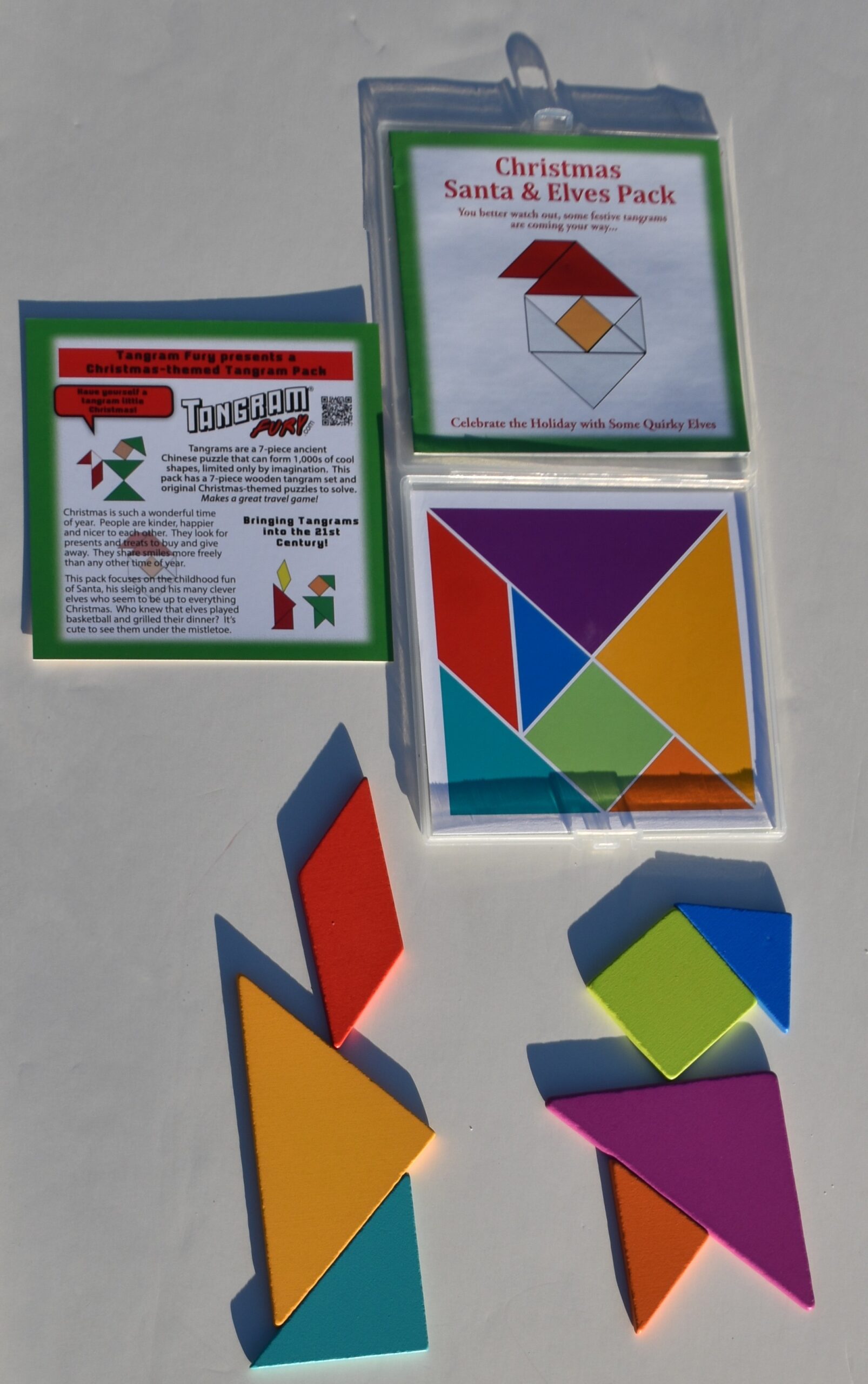 Each Santa and Elves Tangram Pack includes a full-color booklet with clear instructions and dozens of themed silhouette puzzles to solve, with their colorful solutions printed on the reverse side of each page. You’ll also receive a set of vibrant wooden pieces of the classic seven-piece tangram, a color-coded guide that shows exactly how to store the pieces when you’re finished, and a clear plastic storage case that neatly holds everything in a compact 5.5″ × 5.5″ × ½” container. Weighing less than five ounces, this pack is easy to store at home and simple to take along on trips by car, plane, boat, or bicycle.